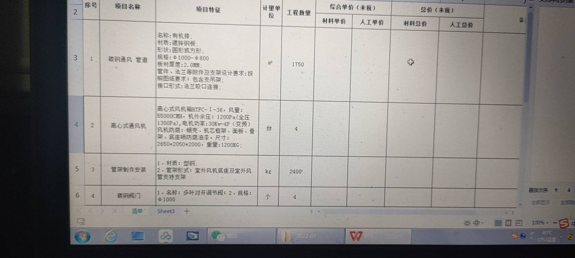 離心式風機箱HTFC-Ⅰ-36,風量:55000CMH,機外余壓:1200Pa(全壓1300Pa),電機功率:30Kw-4P(變頻) 風機防腐:蝸殼、機芯框架、面板、骨架、底座噴防腐油漆。尺寸:2650*2050*2000,重量:1200KG;1、材質:型鋼; 2、管架形式:室外風機底座及室外風管支持支架,3、名稱:多葉對開調節閥;2、規格:φ1000,4、名稱:多葉對開調節閥;2、規格:φ800,5、名稱:多葉對開調節閥;2、規格:φ500