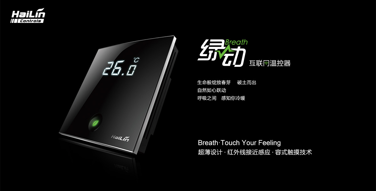 綠動(dòng)溫控器適用于中央空調(diào)風(fēng)機(jī)盤(pán)管系統(tǒng)或風(fēng)管道系統(tǒng),自動(dòng)調(diào)節(jié)室內(nèi)溫度。微弧線曲面設(shè)計(jì)彰顯柔美與力量融合,面板整體睿墨含蓄,尊貴雅致,綠葉呼吸燈時(shí)尚點(diǎn)綴,如呼吸間感受生命律動(dòng),象征生命萌發(fā)。