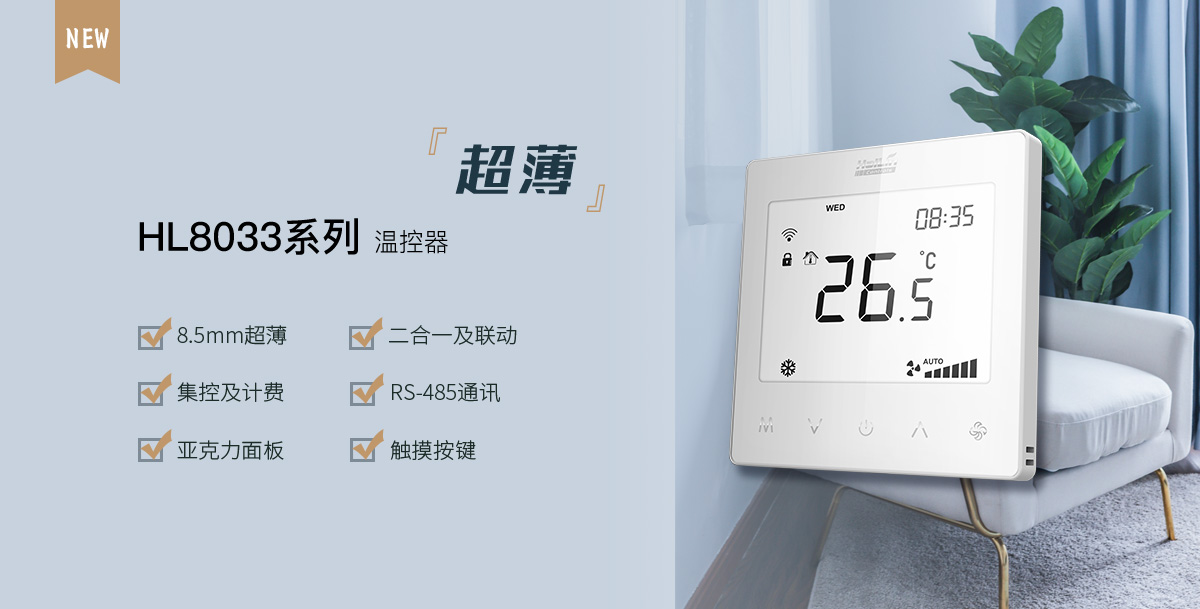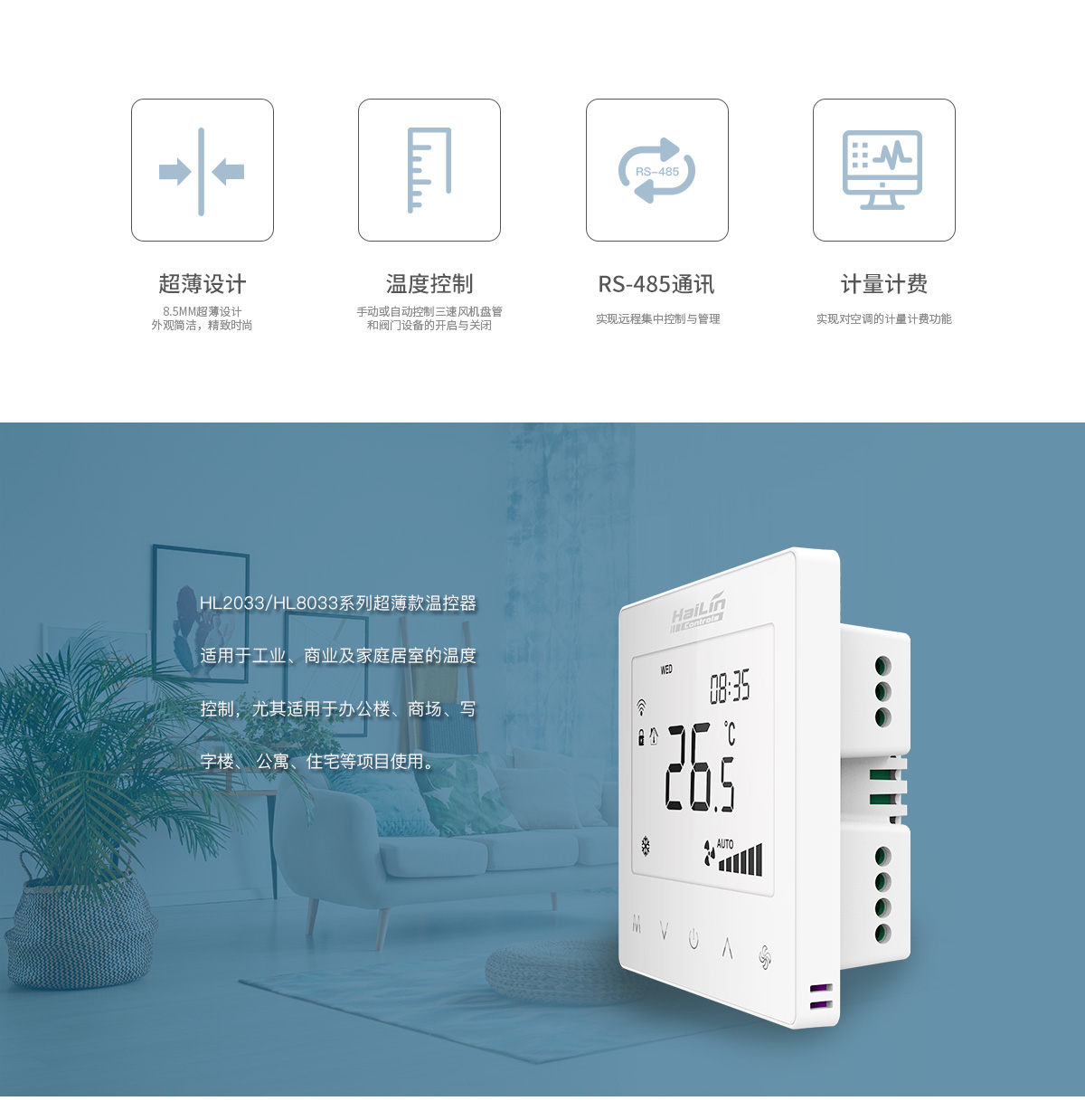 HL8033 系列溫控器超薄機身設計,纖薄靈巧,精致雅觀;大液晶屏,觸摸按鍵,高透亞克力面板,外觀簡潔大方,適用于工業、商業及家庭居室的溫度控制,控制普通交流三速風機盤管和閥門設備的開啟與關閉。采用 RS485 通訊方式,實現遠程集中控制與管理,并且通過監測風機和閥門的運行狀態,實現對空調的計量計費功能;空調采暖二合一,可聯動控制;尤其適用于辦公樓、商場、寫字樓、 公寓、住宅等項目使用。