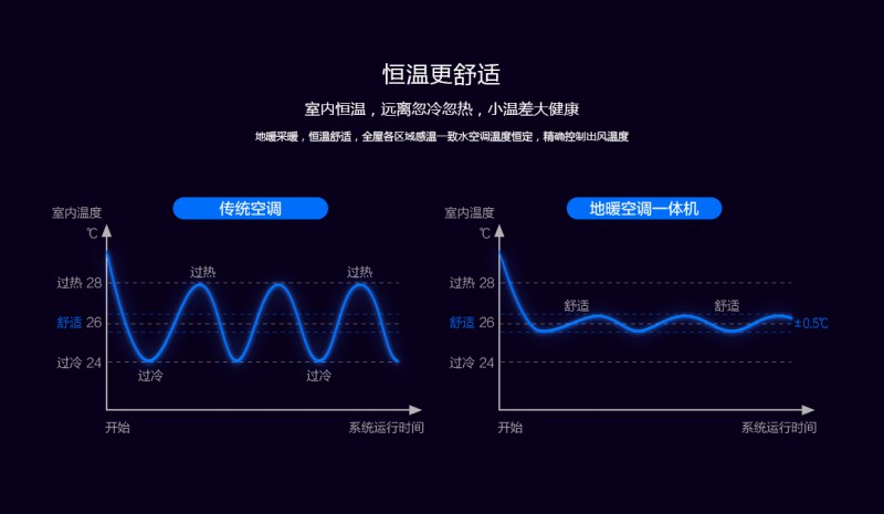 中廣歐特斯地暖空調一體機雙子星2代系列產品,采用全直流變頻技術,超寬運行范圍,覆蓋全國所有地區,挑戰極限環境,滿足用戶多樣化的冷暖需求,真正的制冷實力派,IPLV4.5,制冷超一級能效,采用EVI+ELI專利并聯技術,獨有節能模式,-15℃環溫下制熱能力無衰減,-35℃穩定運行。是真正的采暖大行家。對比柴油鍋爐,電暖氣,燃氣等傳統采暖方式,雙子星2代更節能,更舒適,更恒溫,更靜音。更有核心控制技術,多重安全保障,產品性能更穩。