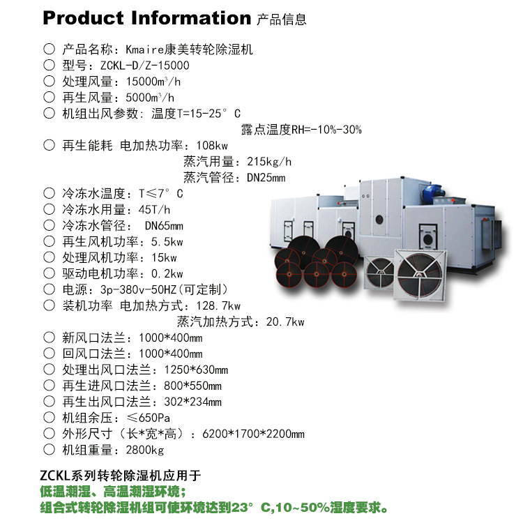 ZCKL系列轉輪除·濕空調機組使用時,用戶需提供T≤7°C的冷凍水;或由本公司隨機匹配提供相對冷量負荷的制冷機組。