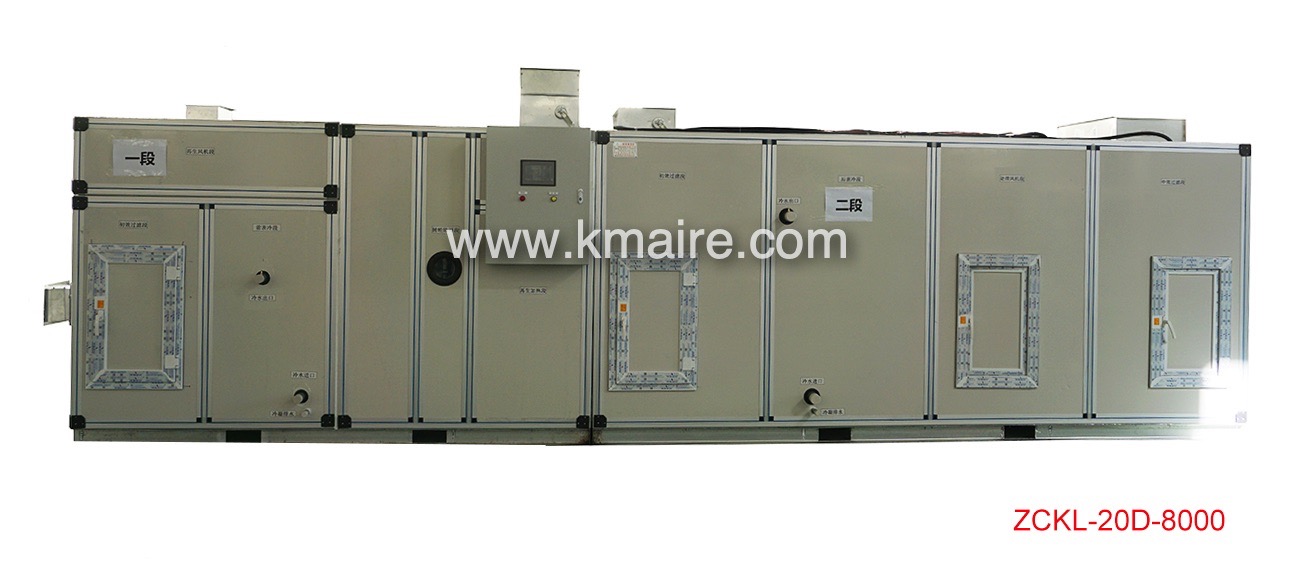 1、ZCKD低露點轉輪除濕機組主要由初效過濾段、新風表冷段、回風段、混合表冷段、超級硅膠或分子篩轉輪除濕段、冷吹再生區、后表冷段、中效過濾段、均流段、送風段和PLC電氣控制系統組成;