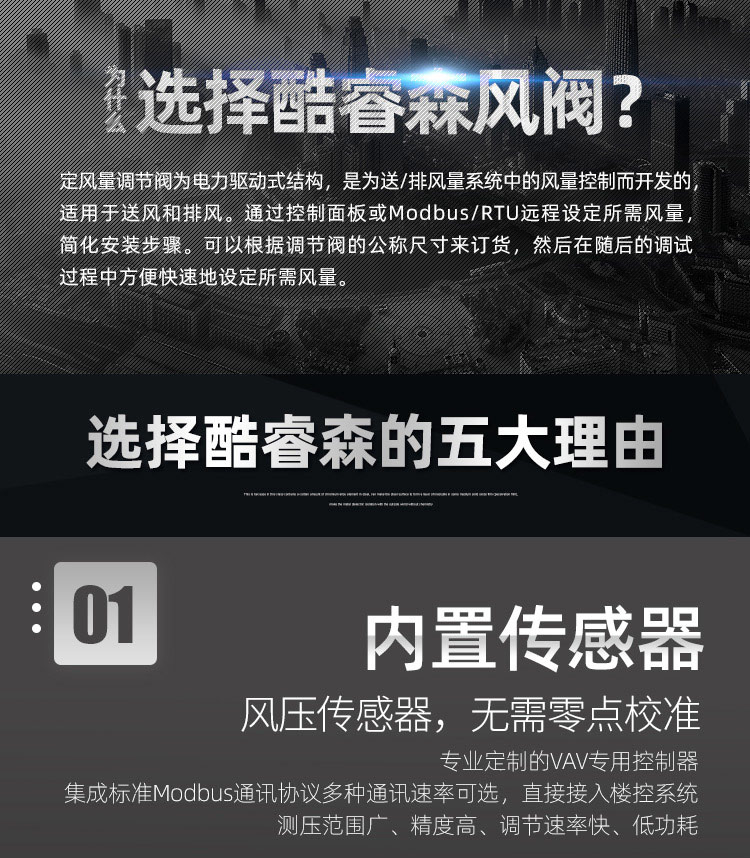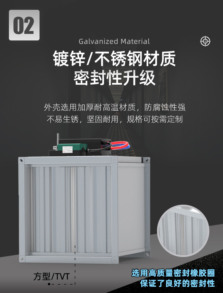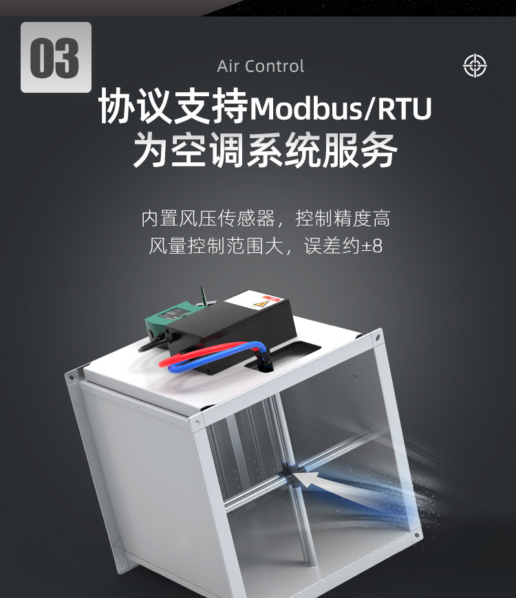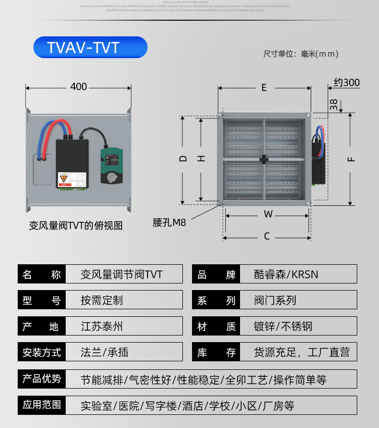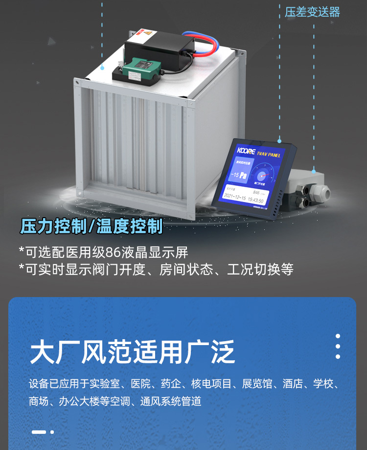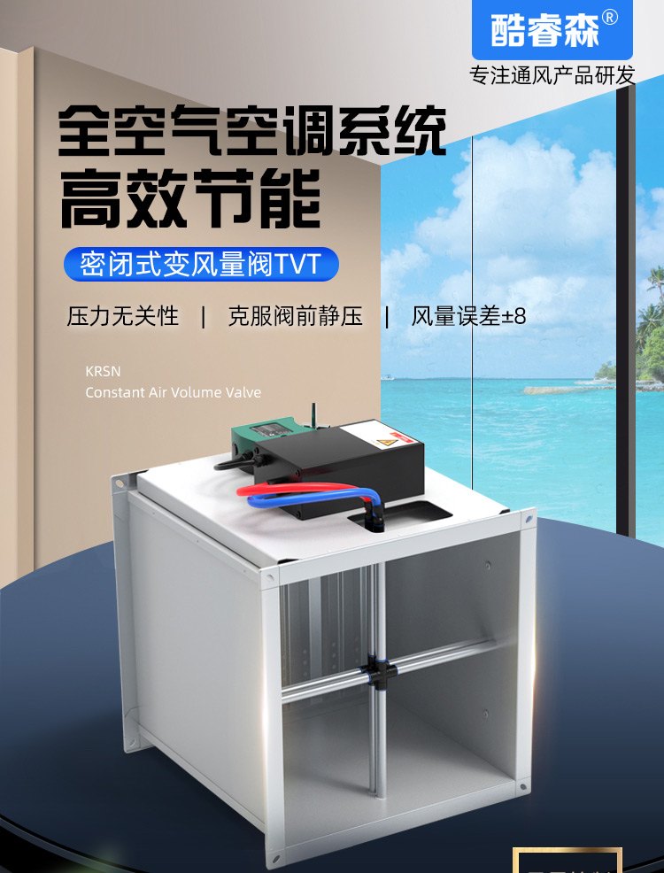 TVAV TVT:矩形變風量調節閥,用于送風或排風,可氣密關閉 ,機械部件和電子控制部件組成一體, 在出廠前都已裝配好,并完成軟管連接和接線。每臺設備都設定至所需的風量,并通過氣流性能測試。 調節閥內配有多葉閥片和用于測量風量的風壓傳感器。 TVAV-TVT設備兩端帶法蘭,用于連接風管; 風量控制采用閉環控制,需外部供電。根據控制要求和運行條件選擇壓力變送器、控制器和執行器。酷睿森控制閥上可以安裝任意知名廠商的執行機構產品來滿足項目的工況要求。